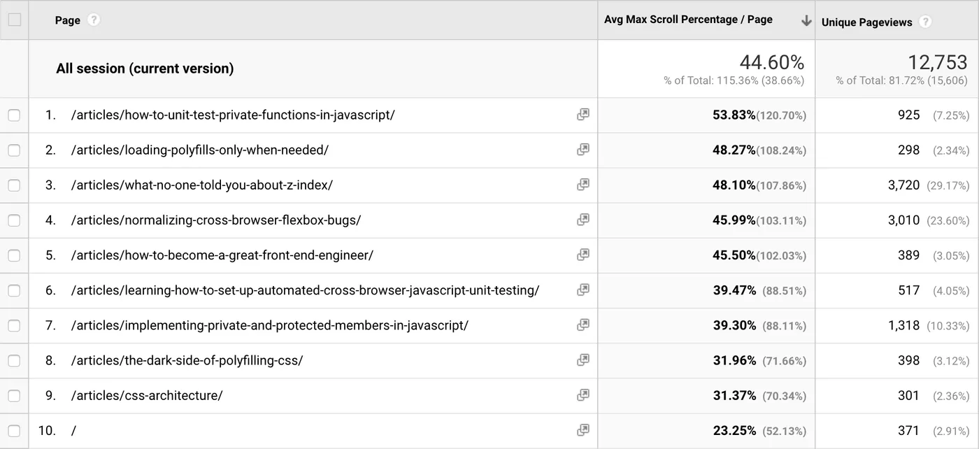 Here’s a screenshot of a custom report I created showing pages with the highest average max scroll percentage on this site over the past 7 days.
